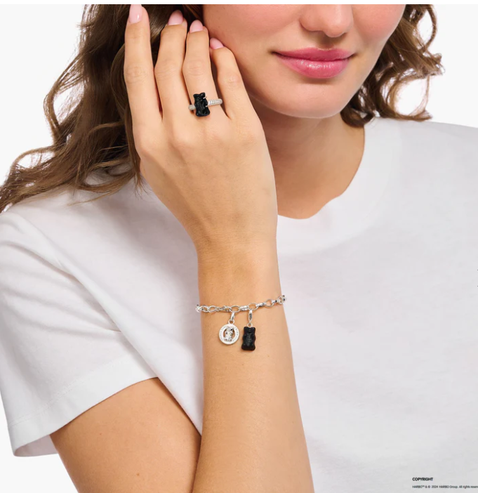 Description THOMAS SABO x HARIBO: Charm black Sweet, sweeter, Goldbears: Immerse yourself in the cheerful world of the THOMAS SABO x HARIBO collection and adorn yourself with deceptively real Goldbears. Use the charms, which reinterpret the famous HARIBO fruit gums in colourful, unique creations, to design your very own individual Goldbears combination on bracelets, necklaces or creoles. Sophisticated pieces of jewellery that evoke childhood memories as elegant companions with a twist or are the perfect finish for your Y2K look. Made from high-quality, shatterproof and slightly satinised crystal glass - THOMAS SABO x HARIBO engraving on the back