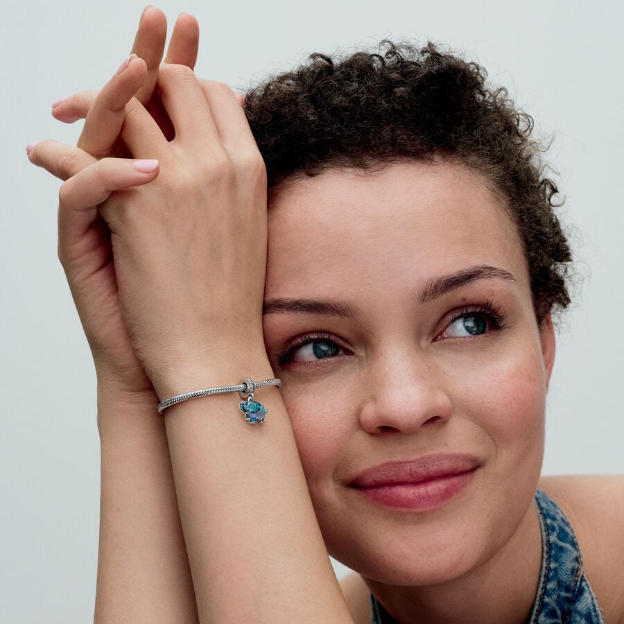 The Blue Murano Glass Elephant Dangle Charm is a colorful ode to a majestic creature. Sterling silver forms an elephant-shaped silhouette around a gradient blue-and-purple Murano glass with a raised ear and a concave rounded eye. Realistic elephant details include an uplifted trunk, feet and a swirling line forming a tail. The bail features a row of pavé and the engraved word "LUCKY." Inspired by the majestic Asian tropical elephant, this charm makes a thoughtful and meaningful gift.