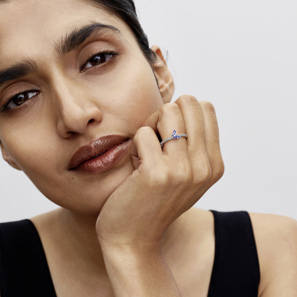 • Butterfly sterling silver ring with cornflower blue crystal and clear cubic zirconia