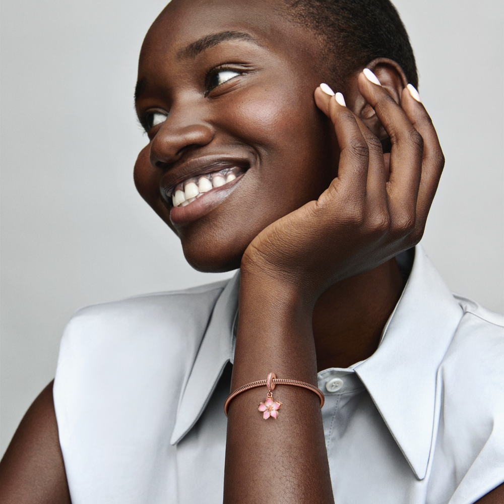 Celebrate the first signs of spring with our 14k rose gold-plated Cherry Blossom Dangle Charm. Featuring hand-applied sea pink and white enamel and accented by sparkling pink cubic zirconia, the petals on our cherry blossom rotate slightly, as if they were being blown in the breeze. A pavé-covered bail is the finishing touch on this must-have floral charm. Style it with other 14k rose gold-plated jewelry for a warm spring look. - Design number: 780667C01