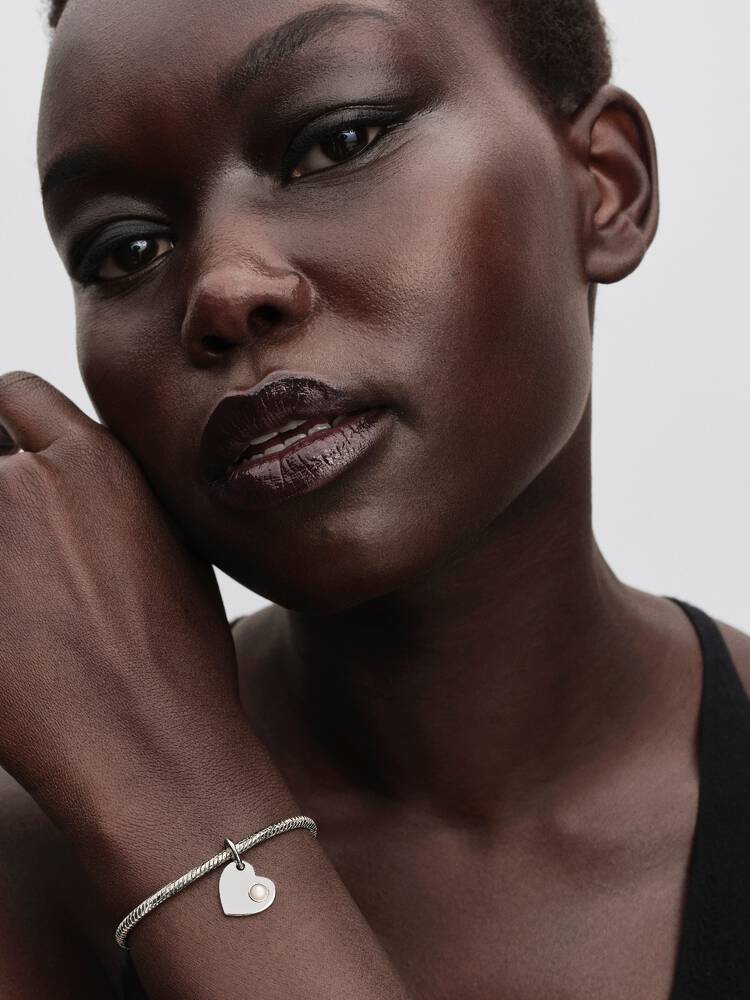 Make this sterling silver heart dangle yours. Featuring a white bioresin man-made mother of pearl on one side, the other is engravable – perfect for a meaningful message. - Design number: 794295C06