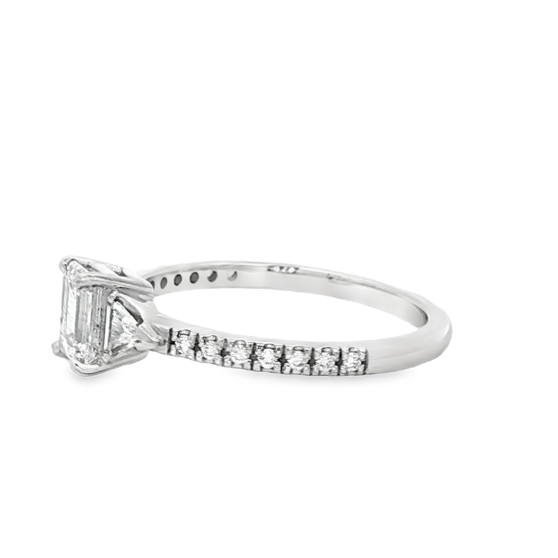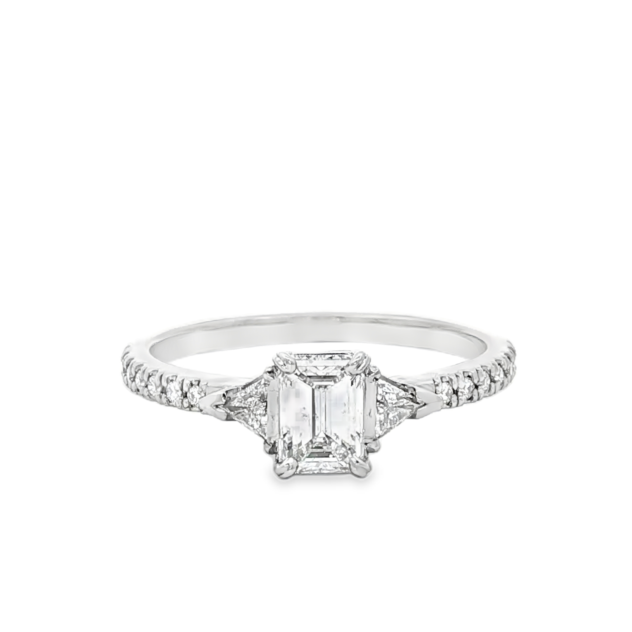 Three-Stone Emerald & Trilliant Cut Diamond Ring Featuring a showstopping emerald cut diamond, in a double 4-claw setting, flanked by trilliant cuts on a diamond set band. Handcrafted in 18 carat white gold