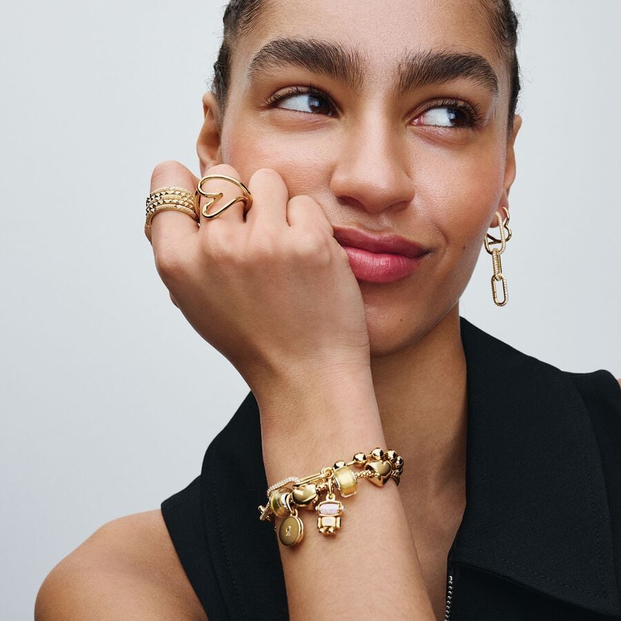 A classic design gets a golden-hued update in the Golden Mini Murano Glass Charm. Shining 24k gold foil is visible on the sterling silver core of this charm through transparent Murano glass, creating a two-toned effect. A Pandora logo is engraved on one side of the core. Designed in a slightly scaled-down size and with a squared profile, this charm is delicate and versatile, offering an effortless complement to any other metal tone you wear it with.