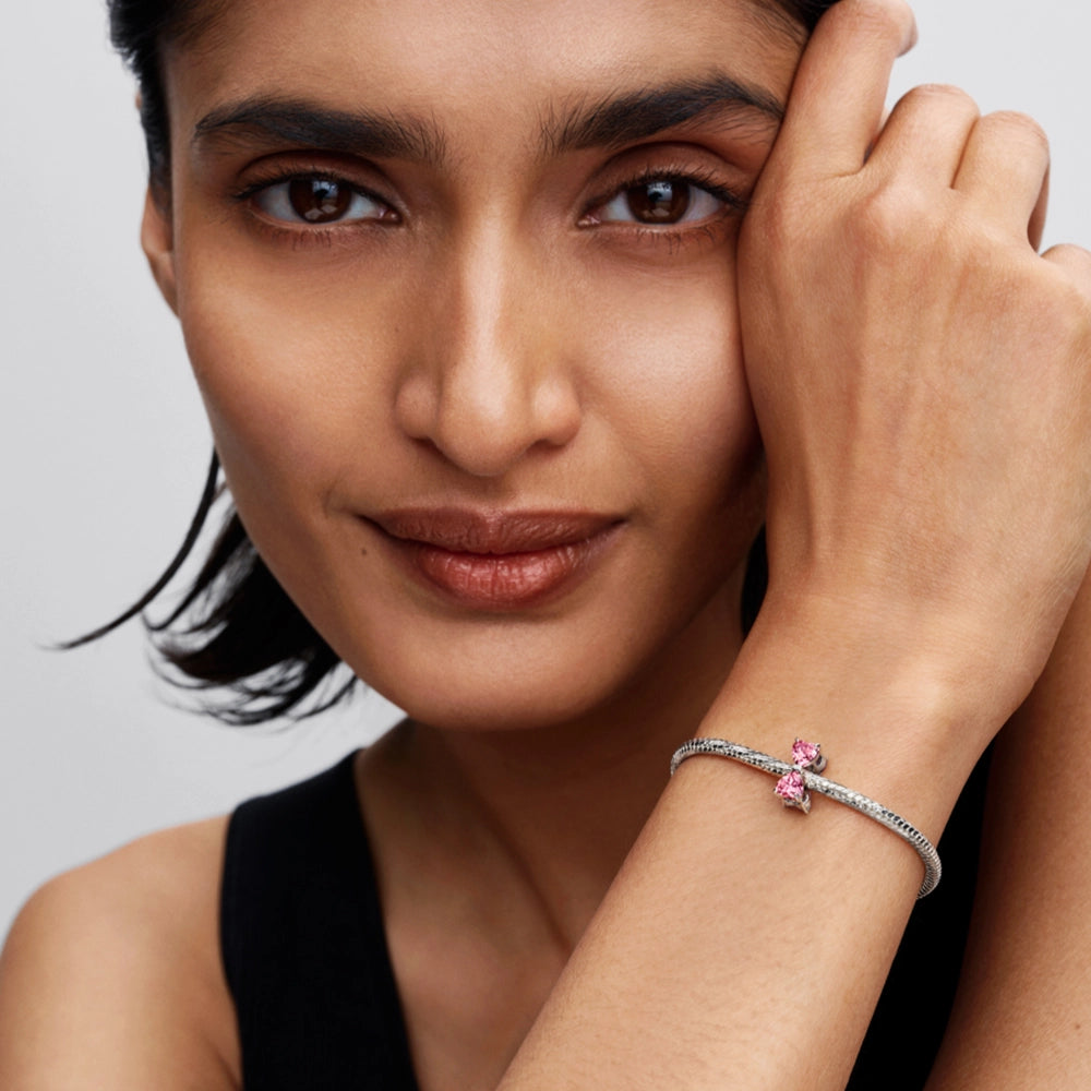 Put a bow on it. Crafted in sterling silver with sparkling pink heart-shaped cubic zirconia, this delicate charm symbolises life’s most beautifully tied moments. The perfect finishing touch to your holiday look. - Design number: 794253C01